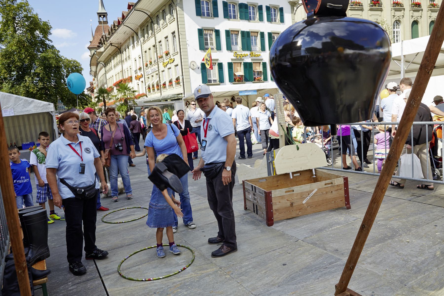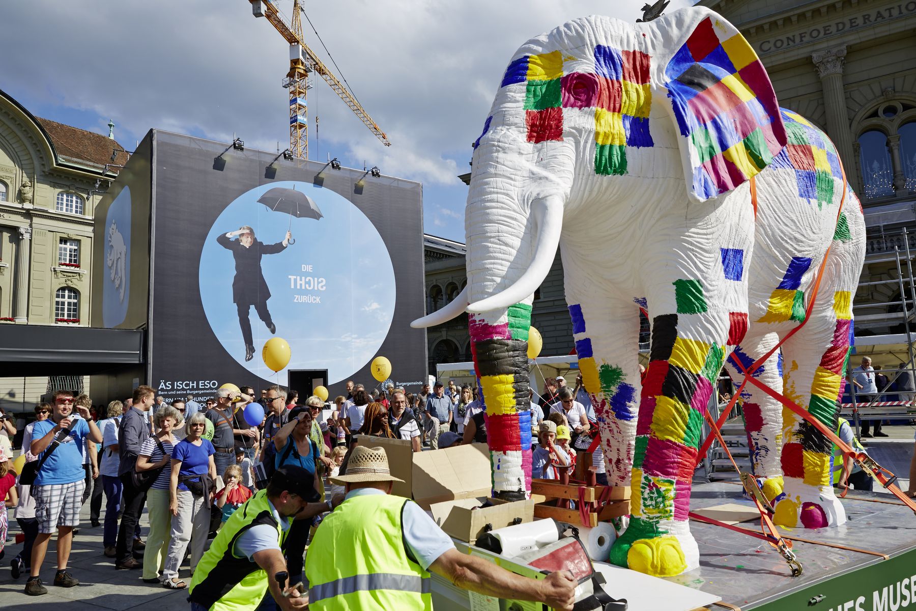 Am 22. August 2014 eröffnete die Burgergemeinde ihren Auftritt ÄS ISCH ESO mit einem rauschenden Fest auf dem Bundesplatz. Bei strahlendem Wetter strömten rund 10‘000 Bernerinnen und Berner vors Bundeshaus und feierten einen halben Tag lang mit. Für Jung und Alt boten sich unvergessliche Momente. Einen Elefanten zu bemalen inmitten des lebendigen «Burger-Märits» war nur eine von vielen Attraktionen. Zu regelrechten Höhepunkten auf der Hauptbühne gerieten die Liveauftritte von Traktorkestar, Steff la Cheffe, Massimo Rocchi und Container 6.
